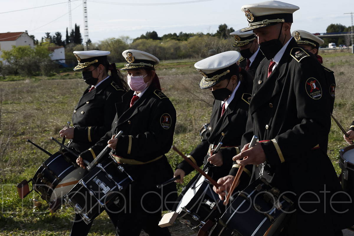 Los tambores y cornetas de la Banda de la Hermandad y Cofradía de Nazarenos de San Juan Evangelista acompañaba con su música a la imagen del Santísimo Cristo de las Misericordias en la tarde de este Viernes de Dolores.