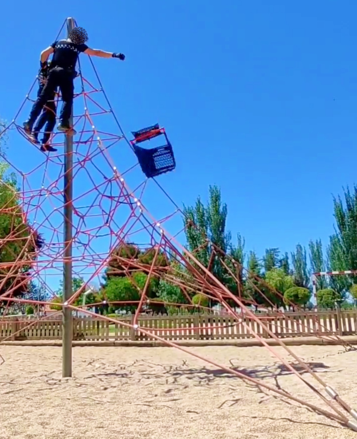 Dos agentes de la Policía Local intervinieron para bajar de una pirámide de cuerdas ubicada en un parque infantil de Albacete un carro de supermercado que algún incívico ciudadano había subido hasta la cúspide de la atracción infantil.