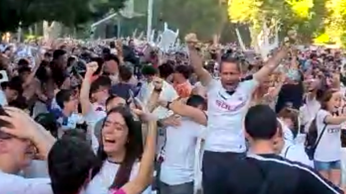 Miles de aficionados que se habían dado cita en el Parque Abelardo Sánchez estallan de alegría con el pitido final del Albacete Balompié-Deportivo de La Coruña que suponía el ascenso del conjunto albaceteño.