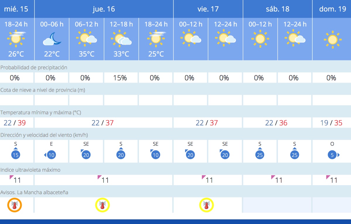 La ola de calor, que terminará el domingo, registrará estos días temperaturas entre 7 y 12 grados centígrados por encima de los valores habituales para estas fechas en buena parte del territorio peninsular y Baleares, según ha informado la Agencia Estatal de Meteorología (AEMET). Albacete capital no será ajena a este tórrido episodio y registrará temperaturas que rondarán los 40ºC.