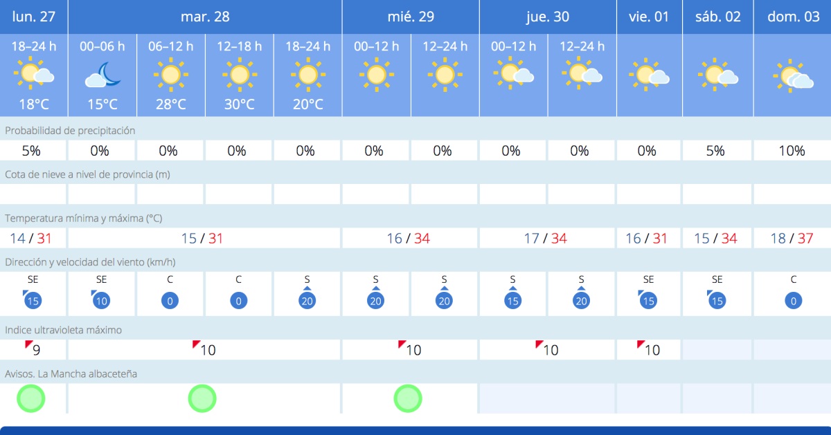 En lo que a Albacete respecta, la predicción de la AEMET para la capital manchega es la siguiente, destacando la subida progresiva de temperaturas, que pasarán de los 31ºC de máxima a los 37 de aquí al domingo: