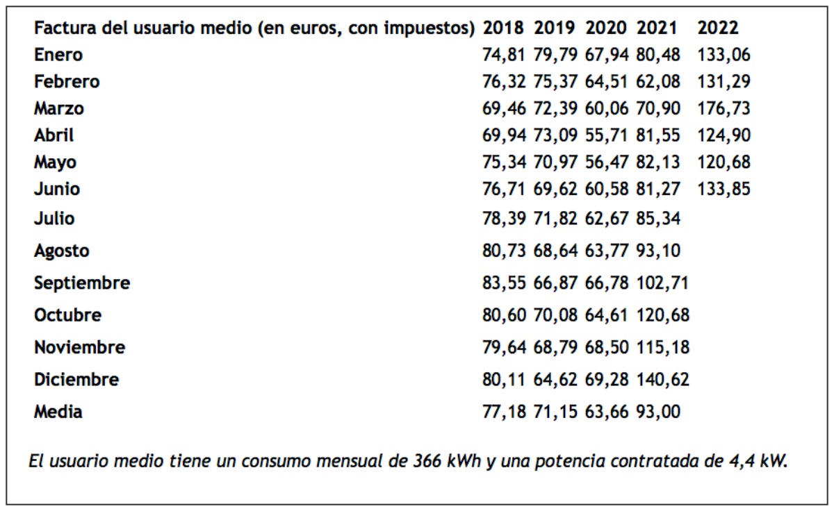 La factura del usuario medio de junio solo tiene por delante las del pasado marzo, cuando alcanzó el máximo histórico hasta la fecha, 176,73 euros, y diciembre del año pasado, mes en que se situó en 140,62 euros.