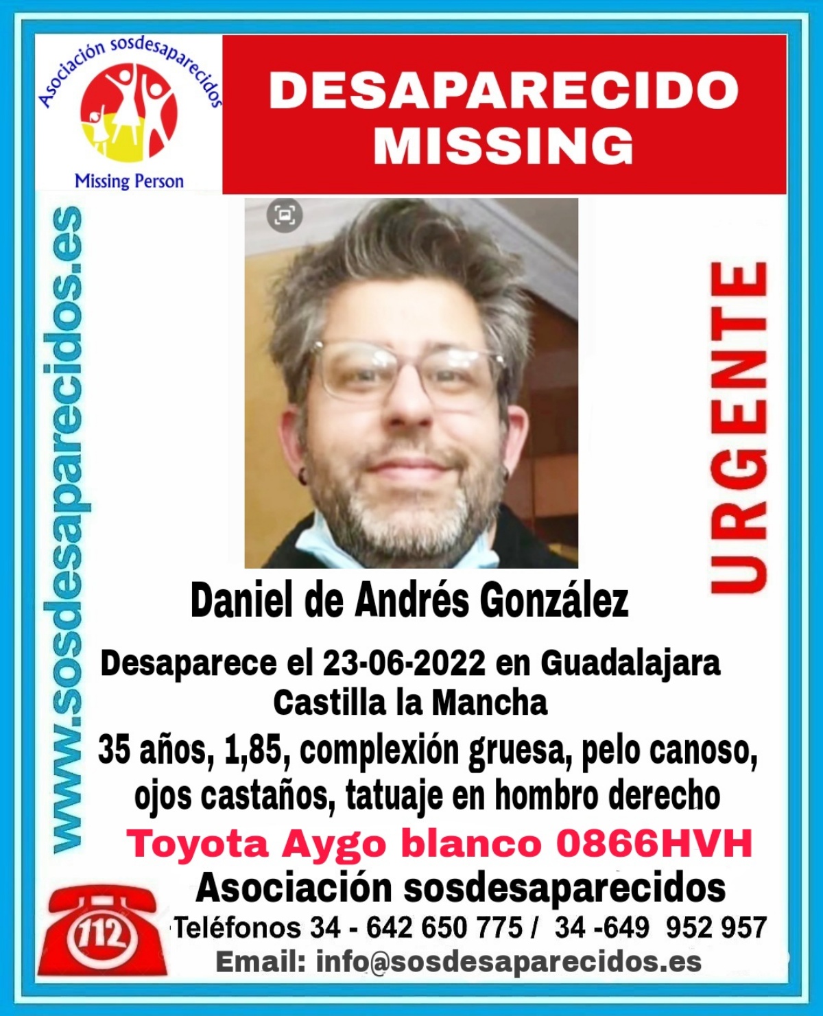 Del mismo modo, se extraía de la información difundida por la Asociación Alerta SOS Desaparecidos que Daniel de Andrés Gonzáles tiene los ojos de color castaño y luce un tatuaje en el hombro derecho. Entre los datos facilitados a la ciudadanía para dar con el paradero de este hombre desaparecido en Guadalajara se encuentran también los del vehículo en el que supuestamente podría haber desparecido, un Toyota Aygo blanco con matrícula 0866 HVH.