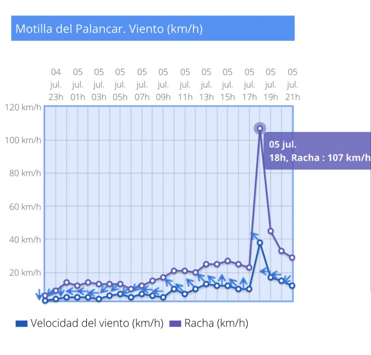 En la tarde de ayer, martes 5 de julio, el viento sopló con fuerza en Motilla del Palancar (Cuenca, Castilla-La Mancha), registrándose rachas de viento que superaron los 100 kilómetros hora y que causaron diversos daños en la localidad.