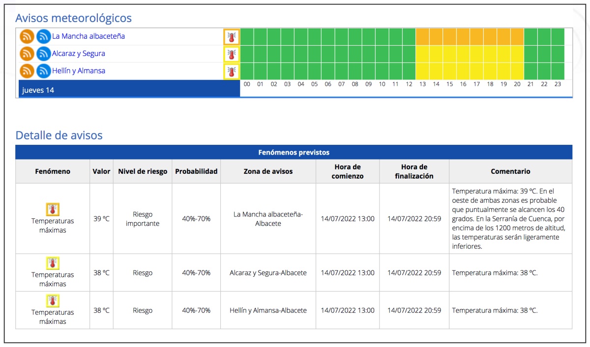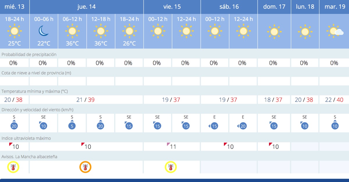 La intensa y extensa ola de calor llegará este miércoles a su momento cumbre, aunque ese pico se mantendrá durante varios días seguidos, según la predicción de la Agencia Estatal de Meteorología (AEMET), que prevé récord de temperaturas máximas y mínimas. En Albacete se activará este jueves la alerta naranja y se espera que los termómetros ronden los 40ºC.