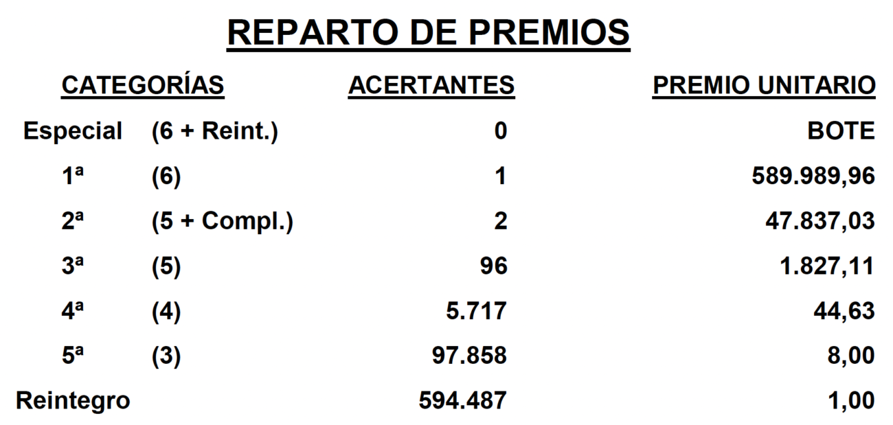 De Segunda Categoría (5 aciertos + Complementario) existen DOS boletos acertantes que han sido
