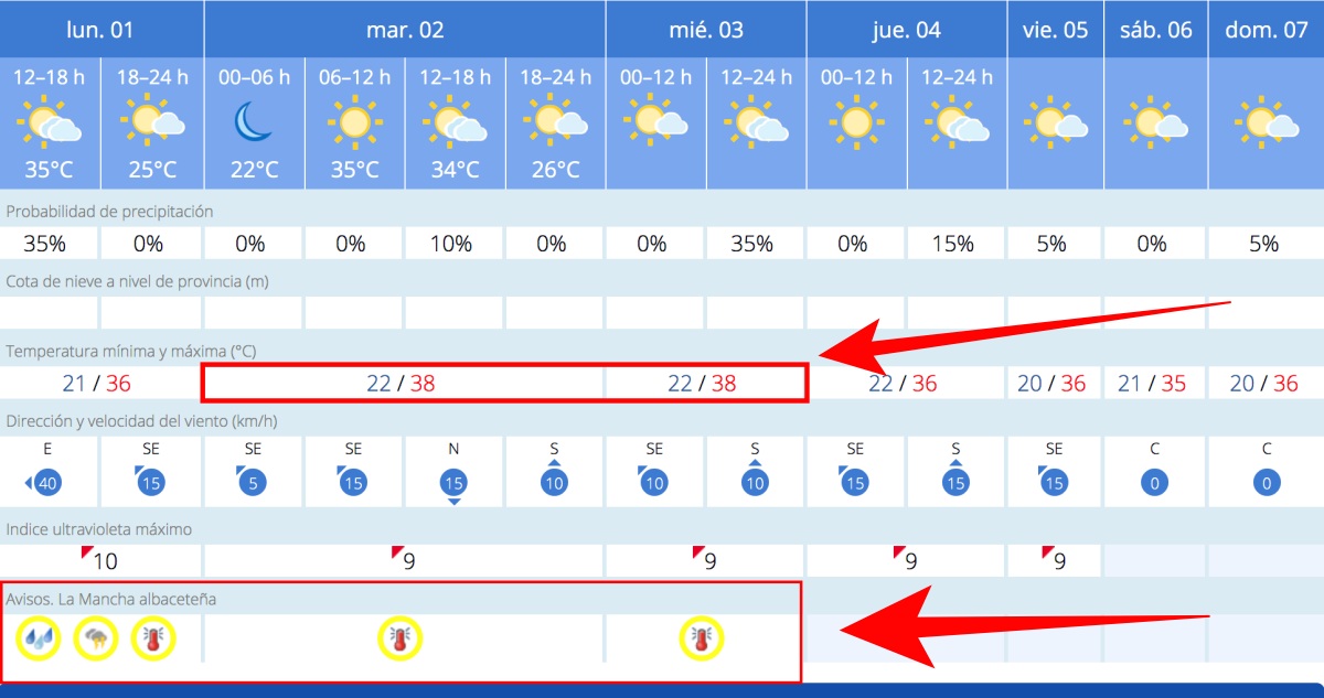Agosto comienza como terminó julio, con calor intenso en buena parte del país, con temperaturas hasta 10 grados más altas de lo normal según las zonas que se mantendrán hasta el miércoles, cuando comenzarán a descender y las lluvias y tormentas afectarán durante esta semana, sobre todo durante la tarde, y especialmente a las zonas de montaña, al centro y al este peninsular, según prevé la Agencia Estatal de Meteorología (AEMET). En lo que respecta a Albacete capital, la ciudad estará en alerta amarilla hoy lunes, mañana martes y el próximo miércoles por altas temperaturas. Una nueva ola de calor, la tercera en lo que va de verano, amenaza a Albacete y a toda España.