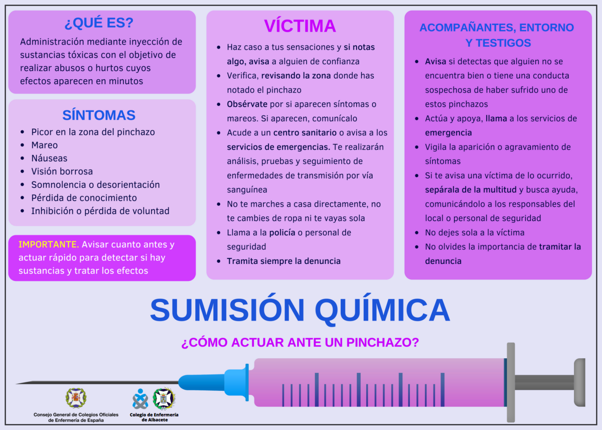El Colegio de Enfermería de Albacete ha elaborado un protocolo para que las posibles víctimas sepan como han de actuar en caso de sufrir un ‘pinchazo’ en estas fechas de fiestas locales y cerca ya de la Feria de Albacete, por ser espacios donde se concentran centenares de personas.