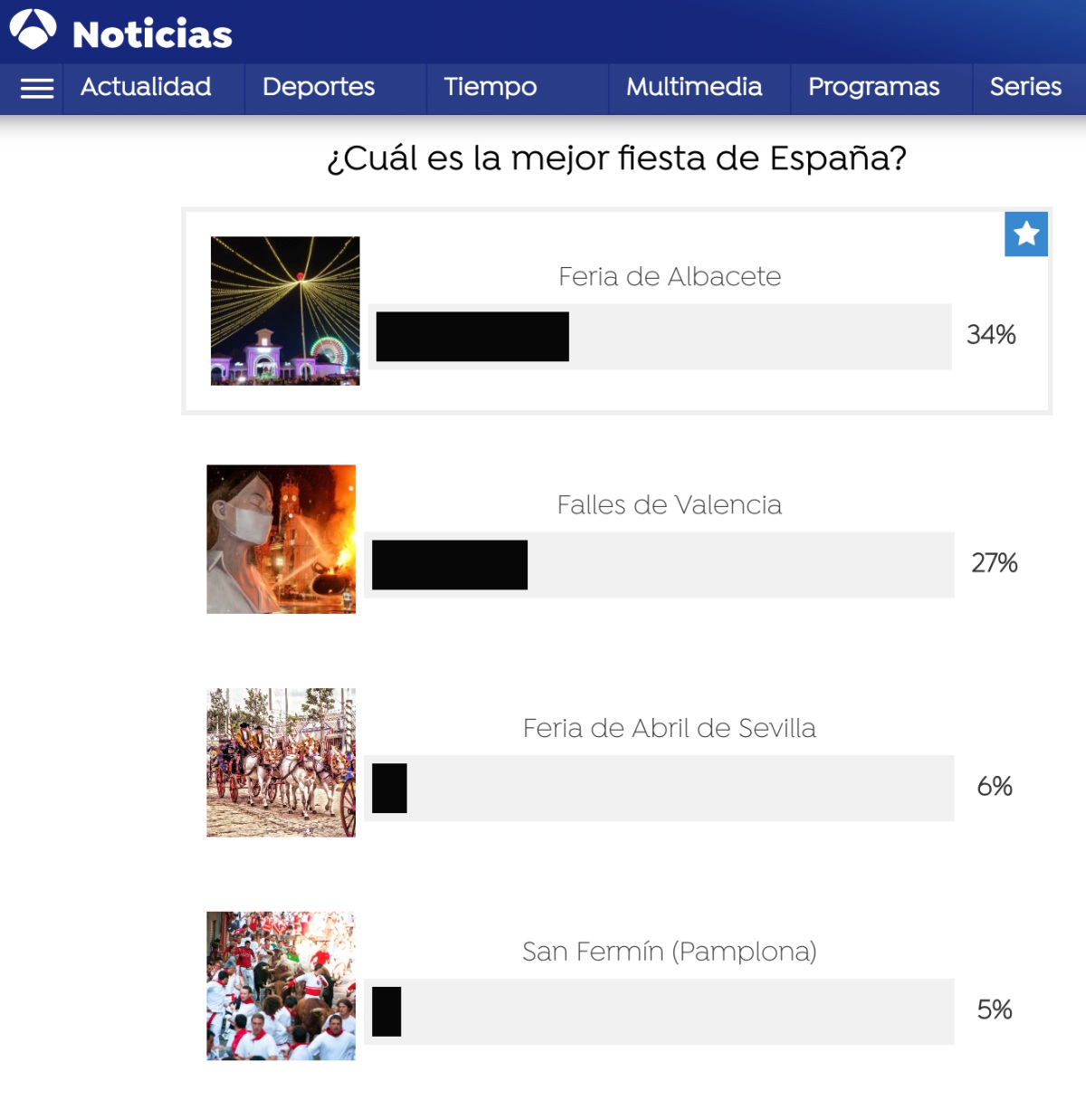 Así se desprende de los resultados que arroja este jueves la encuesta que Antena 3 ha abierto en su web y que, de momento, encumbra a la Feria de Albacete.