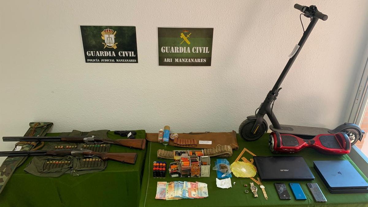 Después de estas nuevas averiguaciones, se autorizó por parte de la autoridad judicial la entrada y registro en dos domicilios de la localidad de Manzanares, en los que se recuperaron objetos sustraídos, diferentes sustancias estupefacientes, dinero, joyas de elevado valor, así como armas de fuego junto con cartuchería, siendo detenidas dos personas más a la finalización de las actuaciones.