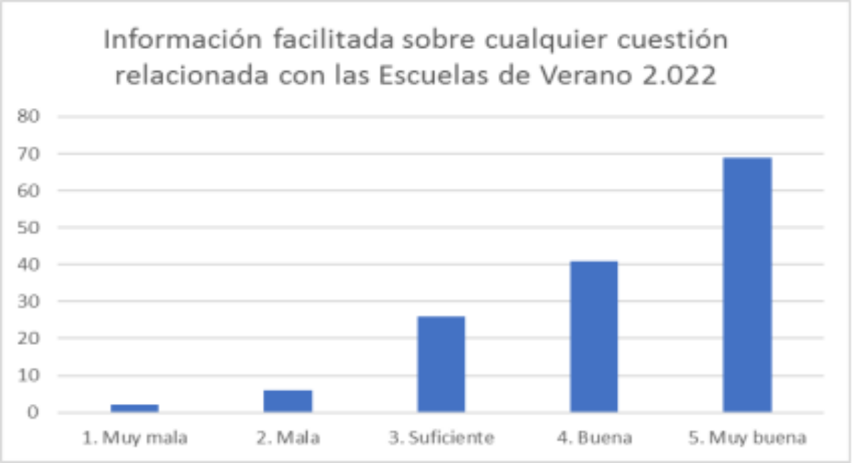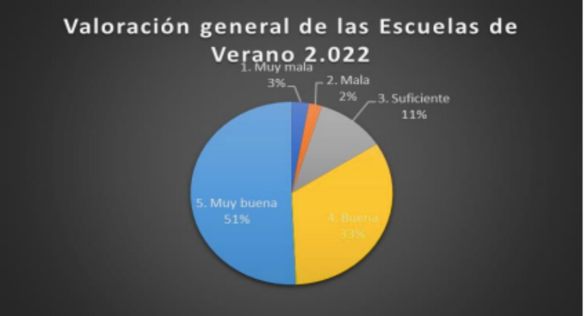 Más del 50% de los familiares encuestados realizaban una valoración “muy buena” de las Escuelas de Verano 2022, mientras que el 33% consideraba que el servicio este año ha sido “bueno”. Además, un 11% realizaba una valoración general de las Escuelas de Verano 2022 “suficiente”, un 3% las consideraba “muy malas” y un 2% “malas”.