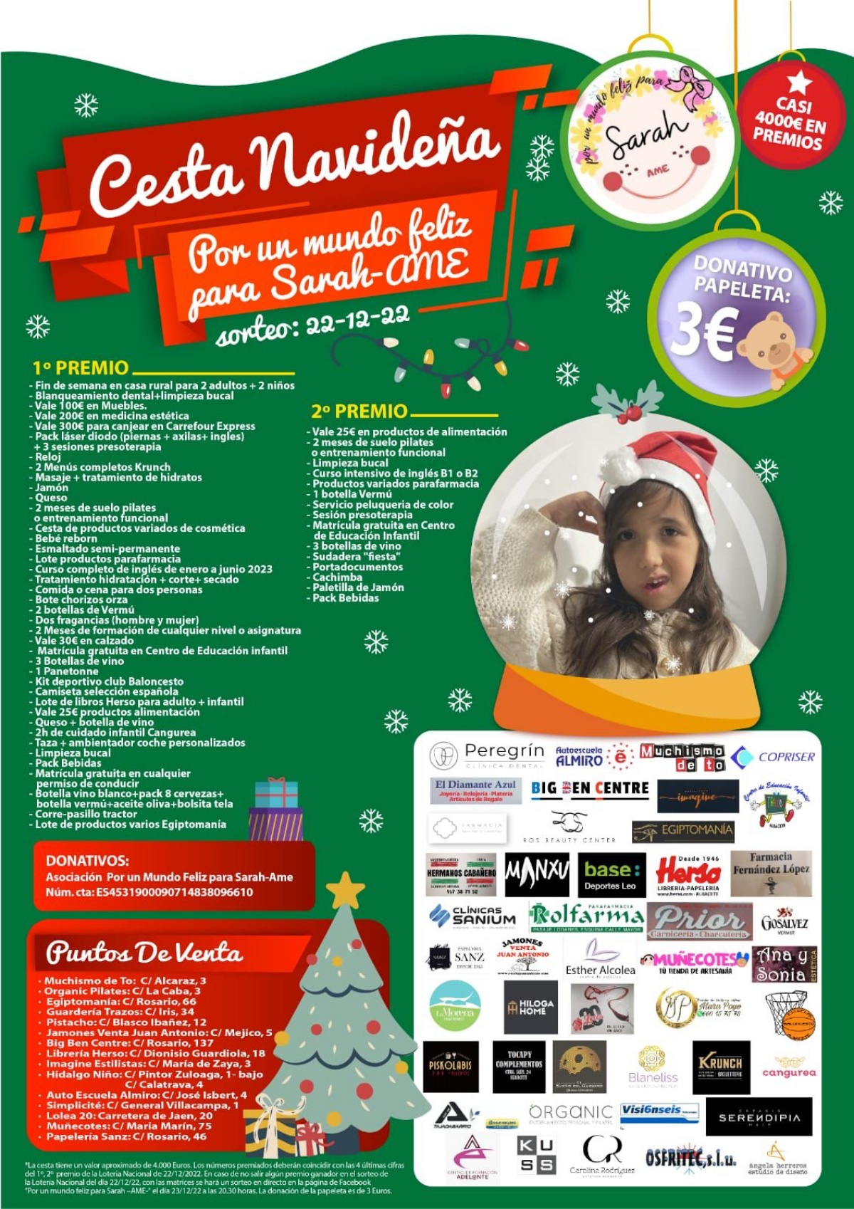 La forma de colaborar y aportar tu especial granito de arena para ayudar a esta niña de Albacete y además optar a conseguir esta cesta de Navidad es muy sencilla. Así, las papeletas para participar en el sorteo de esta cesta navideña suponen un donativo de 3 euros y pueden adquirirse a través de WhatsApp en el número de teléfono 624063526 o en los puntos de venta indicados en el Facebook Por un mundo feliz para Sarah-AME.