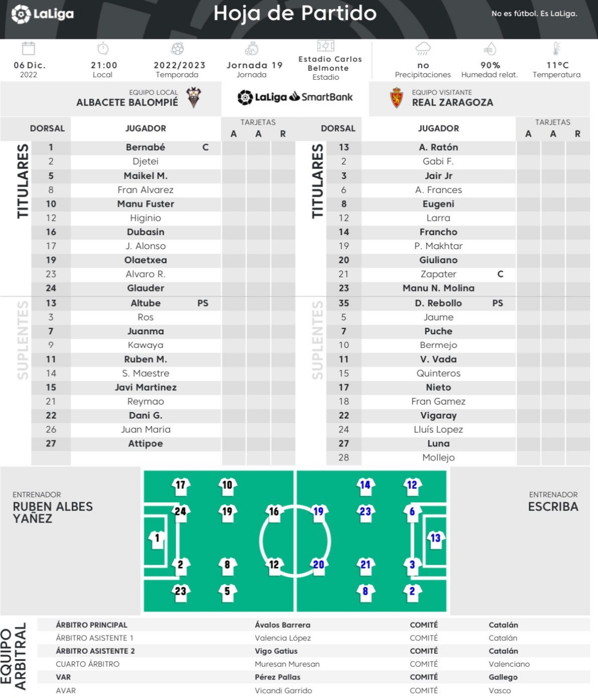 Día muy futbolero este 6 de diciembre a pesar de ser martes y si primero fue la Selección Española en el Mundial de Catar, a partir de las 21.00 horas el balón echó a rodar en el Carlos Belmonte para medir a dos equipos como el Albacete Balompié y el Real Zaragoza que llegaban a la cita con la imperiosa necesidad de ganar para, revertir la mala racha de las últimas jornadas unos y escalar posiciones en la tabla más acordes con lo que cuesta su plantilla otros.