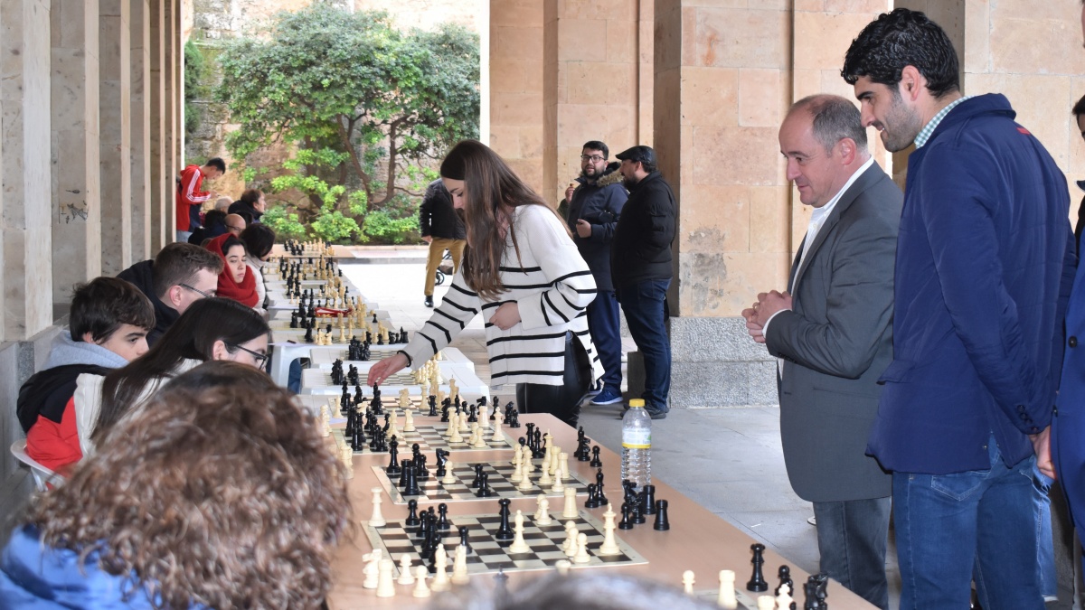 Los soportales del Ayuntamiento de Albacete se han convertido en el escenario de una simultánea de ajedrez ofrecida por la Maestra de la Federación Internacional de Ajedrez y Campeona de España de Blitz 2022, Rebeca Jiménez, a quien el alcalde de Albacete, Emilio Sáez, ha podido felicitar por el título obtenido este verano. Sáez Cruz ha valorado este tipo de iniciativas que además de potenciar la práctica de este deporte, contribuyen a visibilizar también la figura de la mujer dentro del Ajedrez.