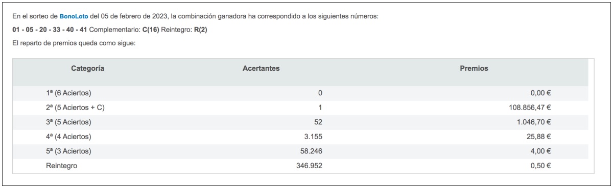 En el Sorteo 36 de Bonoloto celebrado ayer noche domingo 5 de febrero de 2023, ha aparecido un único boleto acertante de Segunda Categoría (5 + C).