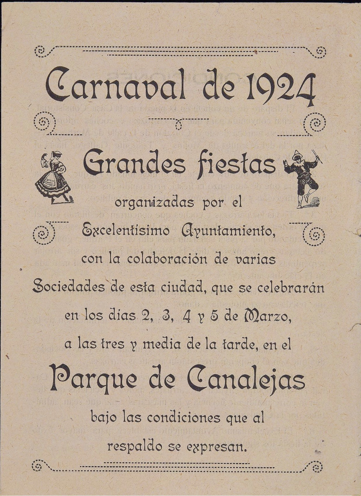 El 18 de febrero de 1924 el Ayuntamiento recibía una carta de José María Noguera, presidente del Círculo de Bellas Artes, donde se pide colaboración para organizar las fiestas de Carnaval con el fin de transformarla en algo más artístico, ante los acontecimientos que se venían desarrollando en años anteriores.