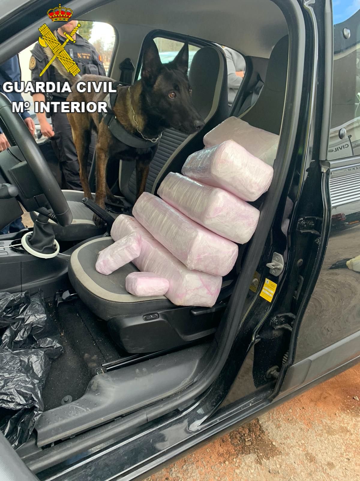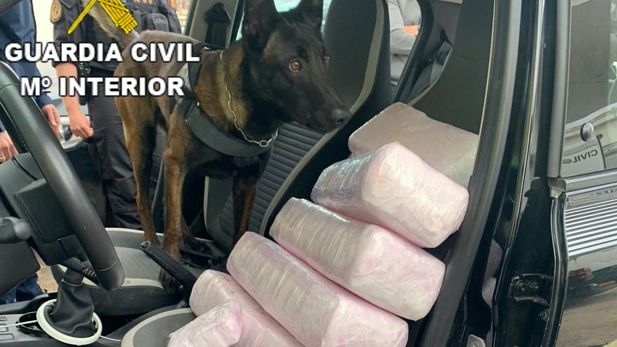 Tras identificar a los ocupantes del turismo, el guía canino introdujo a “Conan”, su pastor alemán malinois en el vehículo, que nada más entrar al coche, mostró un claro nerviosismo, señal de que había captado olor. Sólo faltaba localizar el punto exacto. Poco tardó en marcar inequívocamente en suelo del asiento del copiloto. Bajo la alfombrilla de este descubrieron una oquedad con apariencia de haberse realizado de manera artesanal.