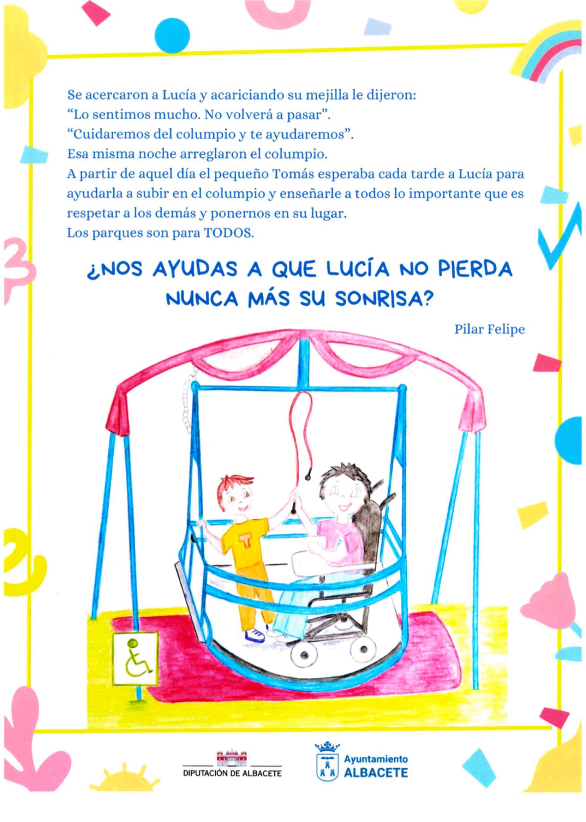 ‘La sonrisa de Lucía’ es el título del cuento con el que el Ayuntamiento de Albacete pretende concienciar para que se haga una utilización adecuada del columpio adaptado instalado en la plaza de Jesús de Medinaceli, en el barrio de Franciscanos, que ha sido objeto de actos vandálicos y de un mal uso reiterado.