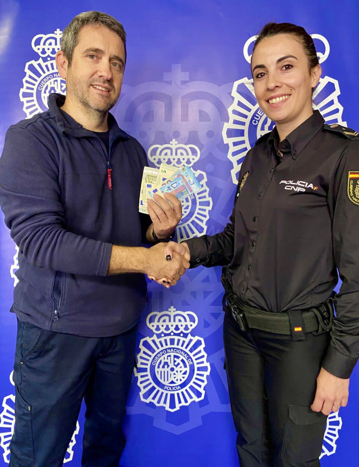 La Policía Nacional ha informado de la entrega en el día de hoy, 29 de marzo de 2023, de 235 euros al ciudadano que aparece junto a la agente del CNP en la imagen que ilustra esta noticia.