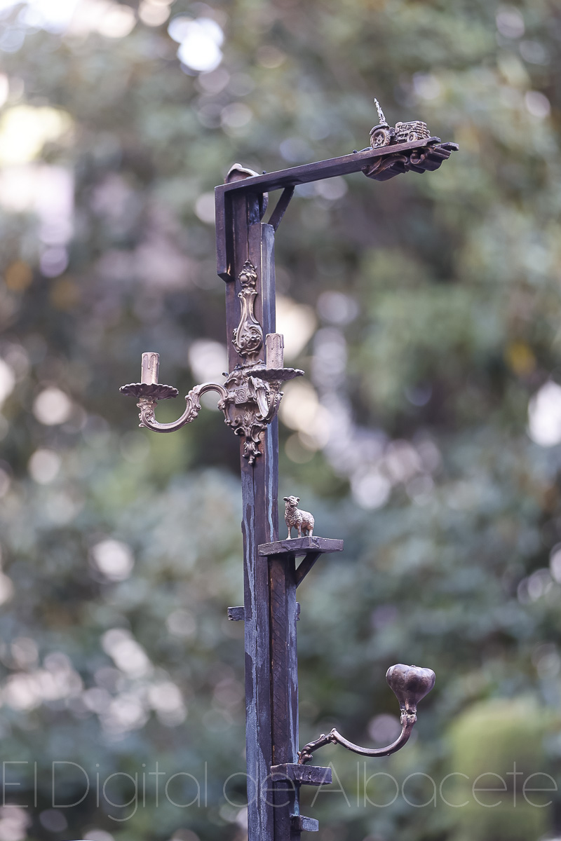 Esta obra escultórica está elaborada en bronce y está rodeada por un letrero luminoso en el que se puede leer el nombre del cineasta albaceteño.