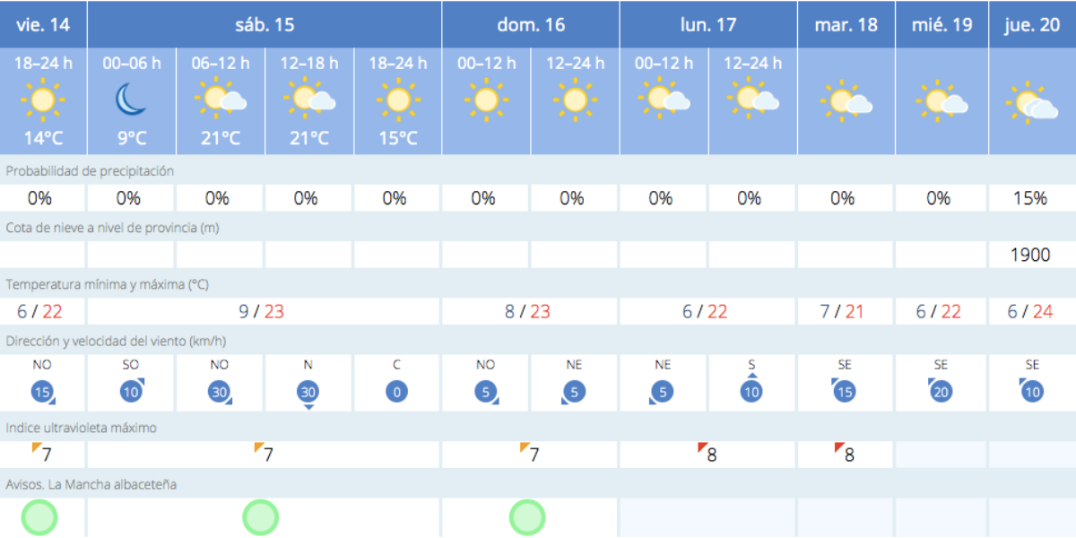 Las termómetros oscilarán entre 9 y 23 grados en Albacete, entre 8 y 26 en Ciudad Real, 5 y 23 grados en Cuenca, entre 8 y 24 en Guadalajara y entre 8 y 25 grados en Toledo.