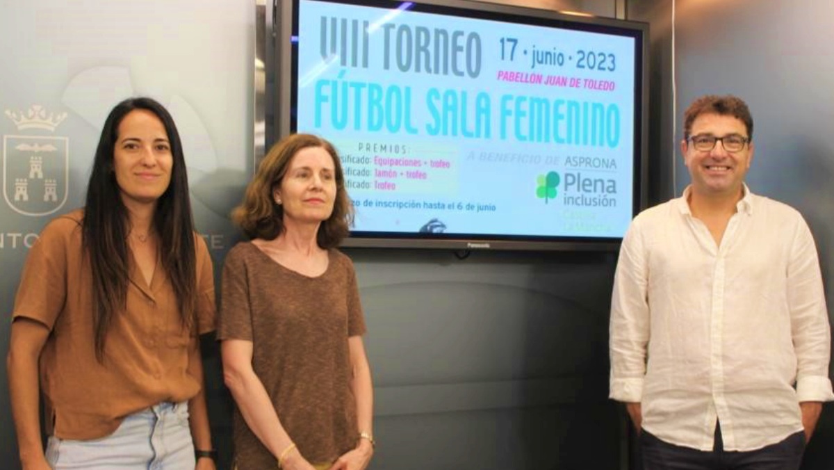 El concejal de Deportes, Modesto Belinchón, junto a la vicepresidenta de Asprona, María Dolores Olivares, y la directora del servicio de deportes de la entidad, Verónica Sánchez, han animado a la ciudadanía a participar en el VIII Torneo Femenino Fútbol Sala a beneficio de Asprona, que tendrá lugar el 17 de junio en el Pabellón Juan de Toledo y cuyo donativo por entrada es de tres euros.