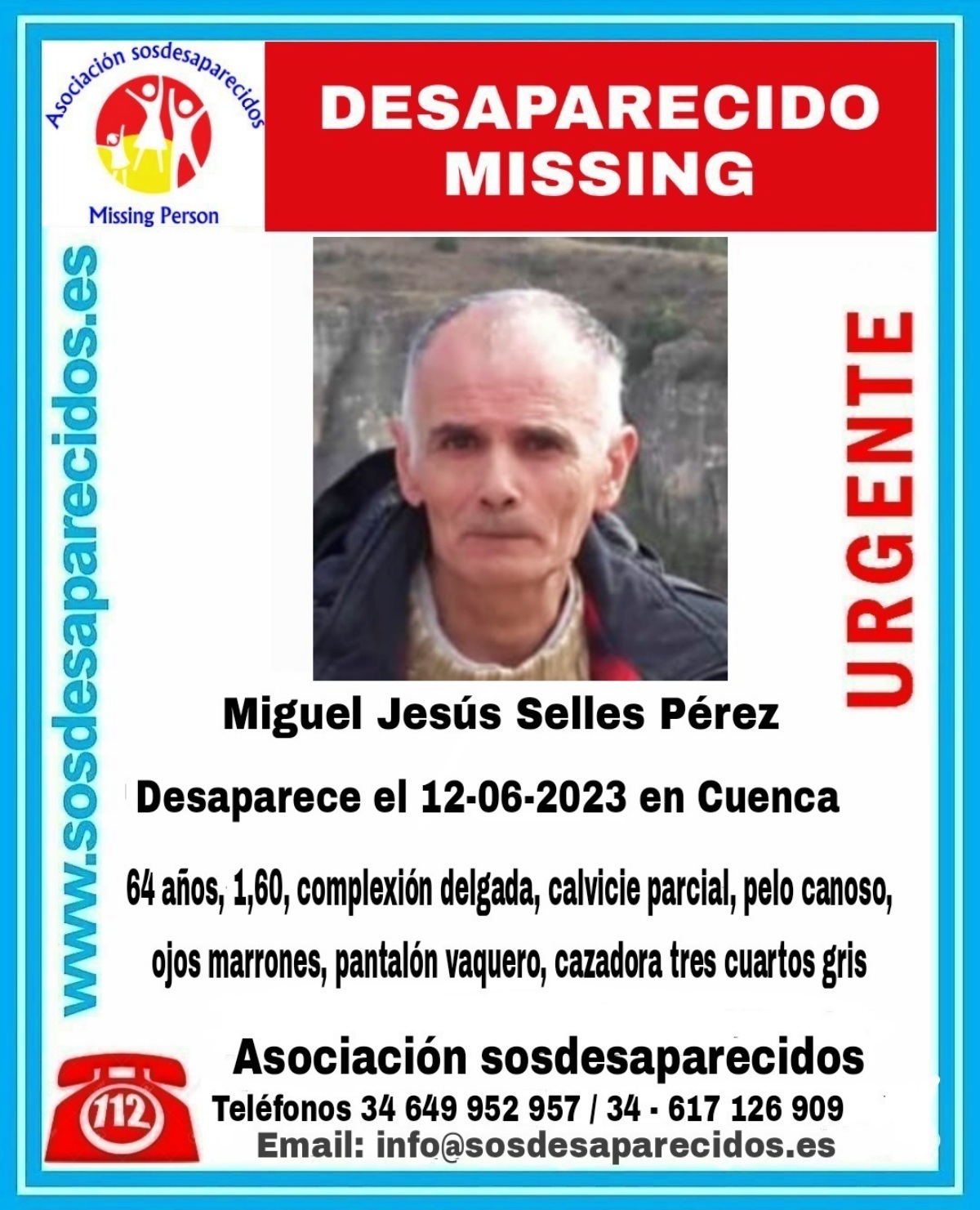 En la alerta de desaparecidos que ha publicado «Sos desaparecidos» en redes sociales, se describe al desaparecido como un hombre de 64 años, 1,60 metros de altura, complexión delgada, calvicie parcial, pelo canoso, ojos marrones, pantalón vaquero y cazadora tres cuartos de color gris