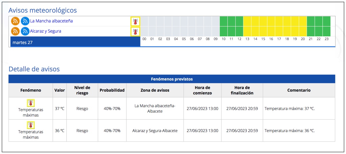 La primera ola de calor del verano continúa este martes, 27 de junio, con 22 provincias españolas además de Albacete en riesgo (amarillo) o riesgo importante (naranja) y temperaturas máximas de 43ºC, según el pronóstico de la Agencia Estatal de Meteorología (AEMET).