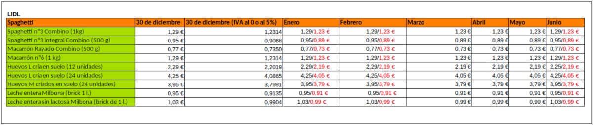FACUA añade que «el precio promocionado como en oferta en un letrero rojo y un precio más caro tachado es idéntico al que estos productos tenían en mayo, cuando no estaban en promoción. Entre estos diez productos de Lidl en los que ha detectado esta práctica hay pastas, huevos y leches».