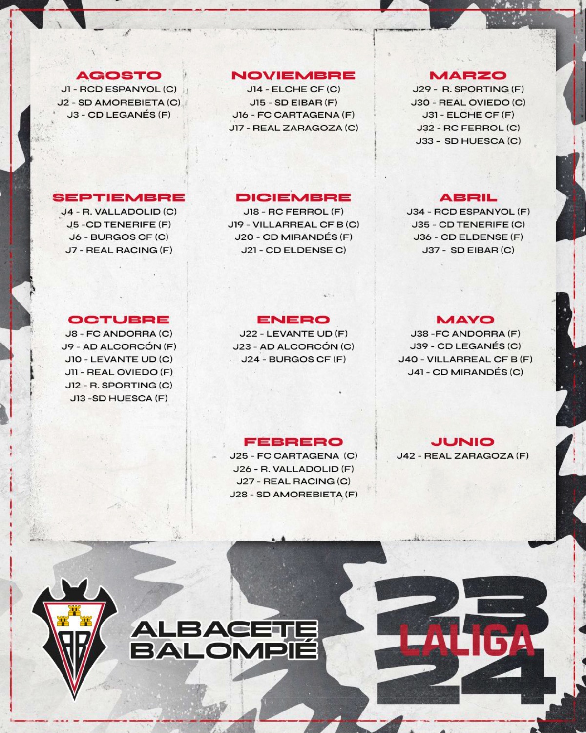 Tras el sorteo realizado este miércoles en la sede de la RFEF en Las Rozas, el calendario liguero del Albacete Balompié es el siguiente, siendo el primer partido en el Carlos Belmonte ante el RCD Español de Barcelona y el último ante el Real Zaragoza en La Romareda: