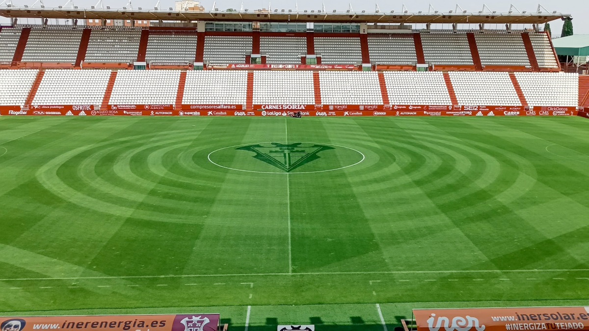 Así pues y a tenor de las imágenes publicadas por el Albacete Balompié en sus redes sociales, lo que más llama la atención es la presencia del escudo del club en el círculo central, que ha sido pintado sobre la hierba.