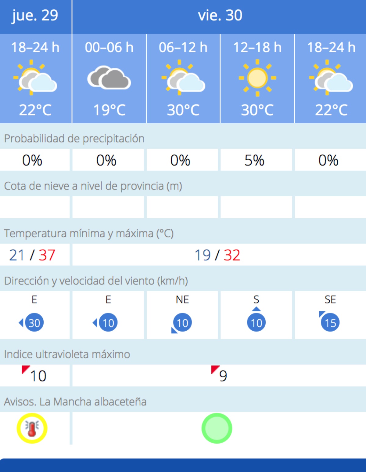 Las temperaturas oscilarán entre los 19 y 32 grados en Albacete, entre 21 y 33 en Ciudad Real, entre 14 y 28 grados en Cuenca, entre 16 y 30 en Guadalajara y entre 18 y 32 grados en Toledo.