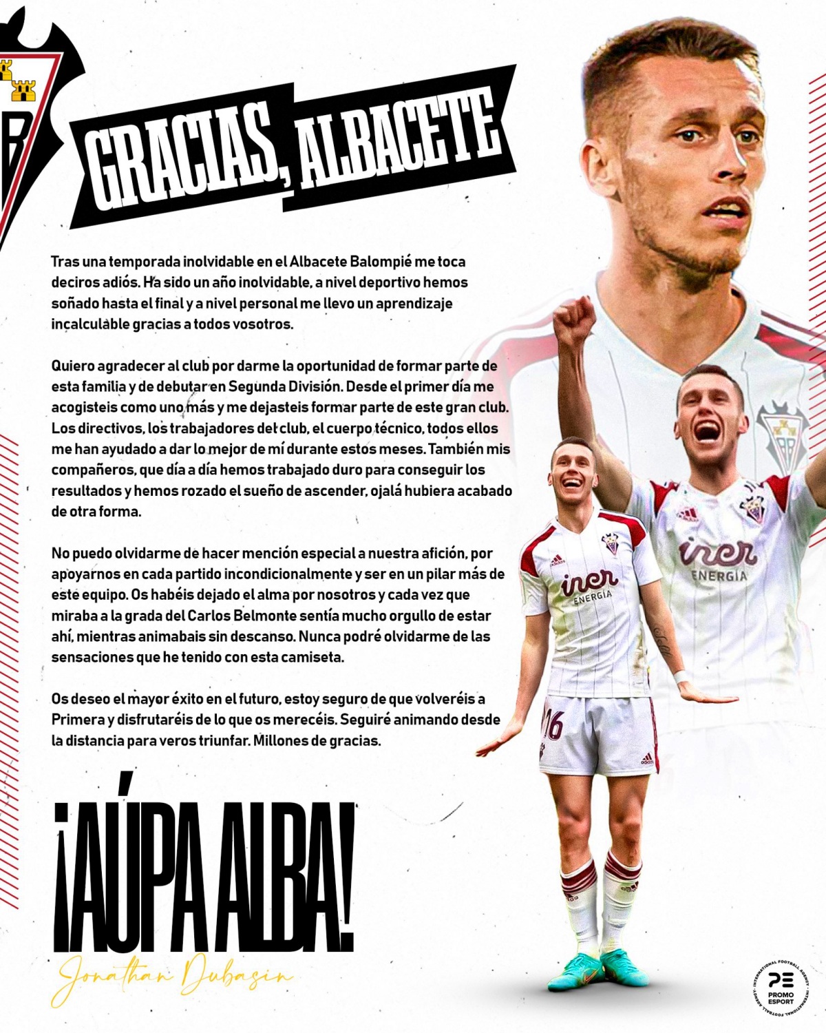 El traspaso de ‘El Pinguino’ Dubasin ya es una realidad y el ya ex futbolista albacetista se ha despedido del club blanco y de su afición con el siguiente mensaje: