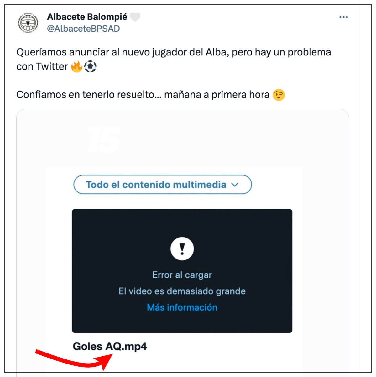 La noticia ya lleva mucho tiempo dándose por hecha, pero hasta esta tarde el Albacete Balompié no ‘había abierto’ la boca al respecto. Y es que, tras anunciar la marcha de Dubasin, el Albacete Balompié ha lanzado un mensaje en redes sociales en el que supuestamente un error en Twitter no le ha permitido al departamento de comunicación subir un vídeo con los goles de ‘AQ’; iniciales que coinciden con Alberto Quiles.
