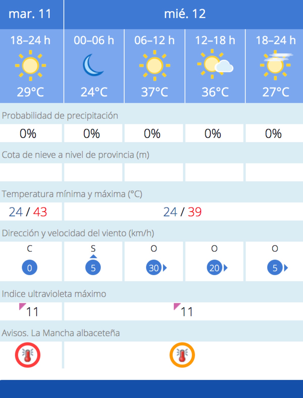 Las temperaturas oscilarán entre los 24 y 39 grados en Albacete, entre 22 y 37 en Ciudad Real, entre 25 y 34 grados en Cuenca, entre 21 y 35 en Guadalajara y entre 21 y 36 grados en Toledo.