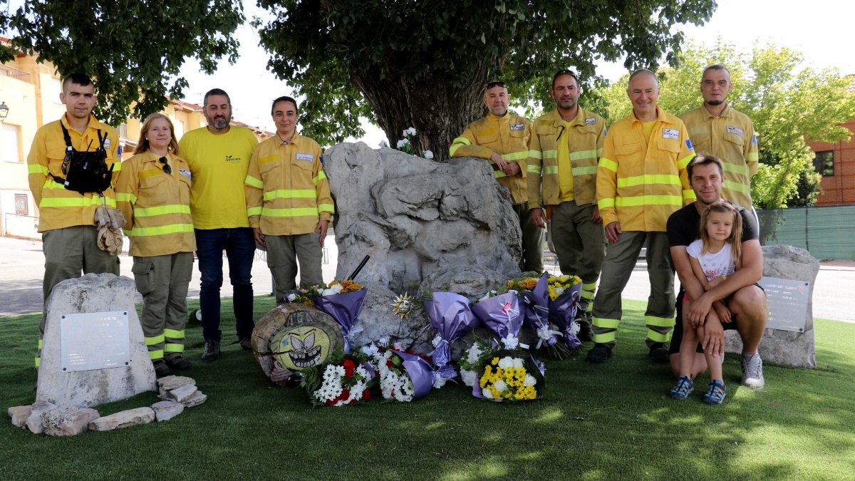 El pueblo de Cogolludo se ha acercado este lunes al monumento que la villa serrana tiene dedicado a las once personas del retén de Cogolludo que perdieron la vida mientras realizaban labores de extinción del incendio de la Riba de Saelices, al verse sorprendidos por el fuego en el Valle de los Milagros.