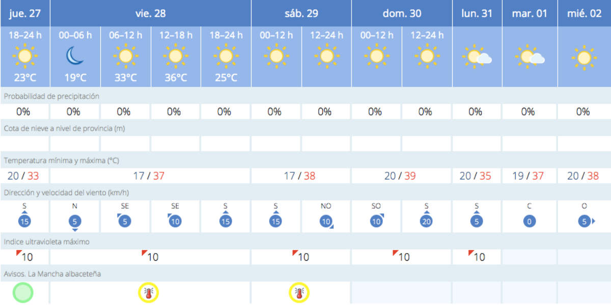 Las temperaturas oscilarán entre los 17 y 37 grados en Albacete, entre 20 y 36 en Ciudad Real, entre 18 y 34 grados en Cuenca, entre 19 y 34 en Guadalajara y entre 19 y 36 grados en Toledo.