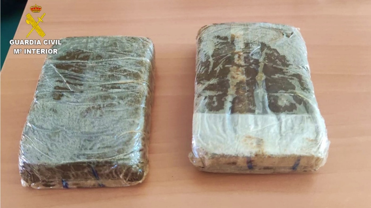 Ante esta situación, la Guardia Civil procedió a efectuar un registro del vehículo, descubriendo en el interior de la maleta que transportaba uno de ellos, dos tabletas de hachís con un peso aproximado de 200 gramos.