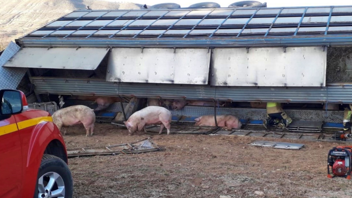 /FOTO: Imagen de archivo de un camión accidentado cargado de cerdos – Fuente: Diputación de Zaragoza/