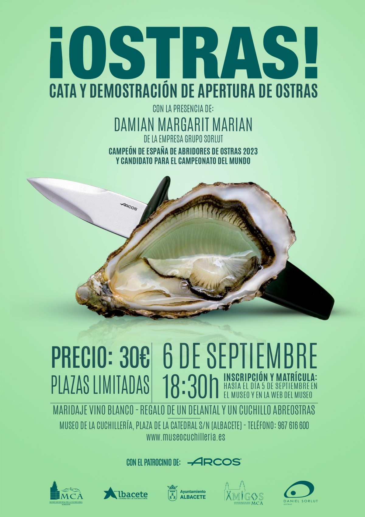 El Museo Municipal de la Cuchillería de Albacete celebrará el próximo 6 de septiembre su XIX aniversario con una cata y demostración de apertura de ostras en la que participará el campeón de España de abridores este año y candidato a campeón del mundo, Damian Margarit, de la empresa Grupo Sorlut.