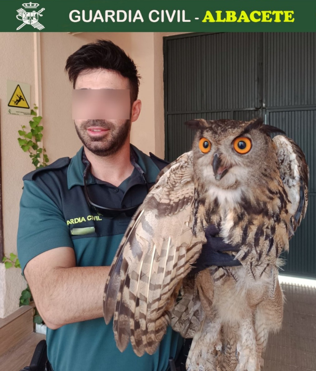 Efectivos de la Guardia Civil trasladaron tras su rescate al Centro de Recuperación de la Fauna Silvestre de Albacete al Búho Real que aparece en la imagen que acompaña esta información.