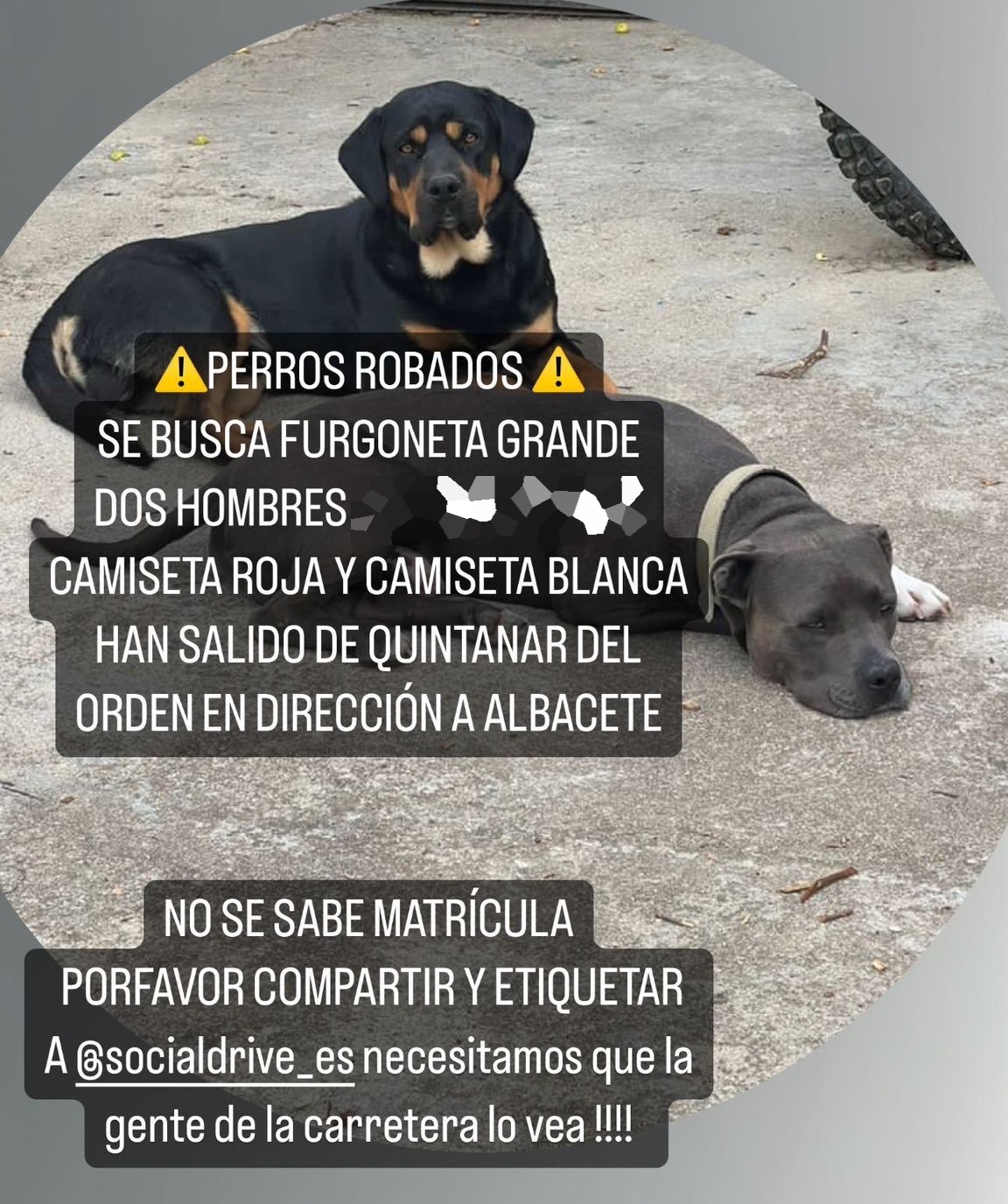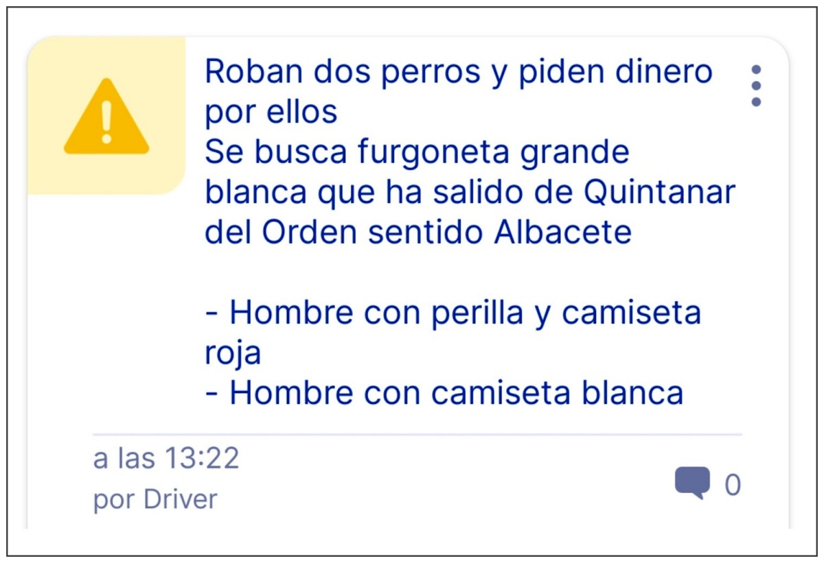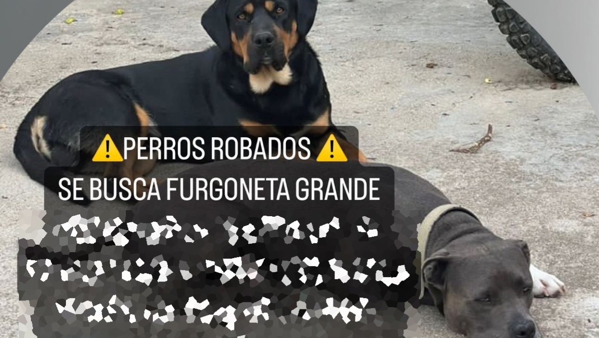 La red social ‘SocialDrive’ ha reportado un aviso a todos los conductores que usan su aplicación alertando del robo de los dos perros que aparecen en la imagen. En dicho aviso se puede leer el siguiente mensaje: “Roban dos perros y piden dinero por ellos. Se busca furgoneta blanca grande que ha salido de Quintanar de la Orden sentido Albacete. Hombre con perilla y camiseta roja. Hombre con camiseta blanca”.