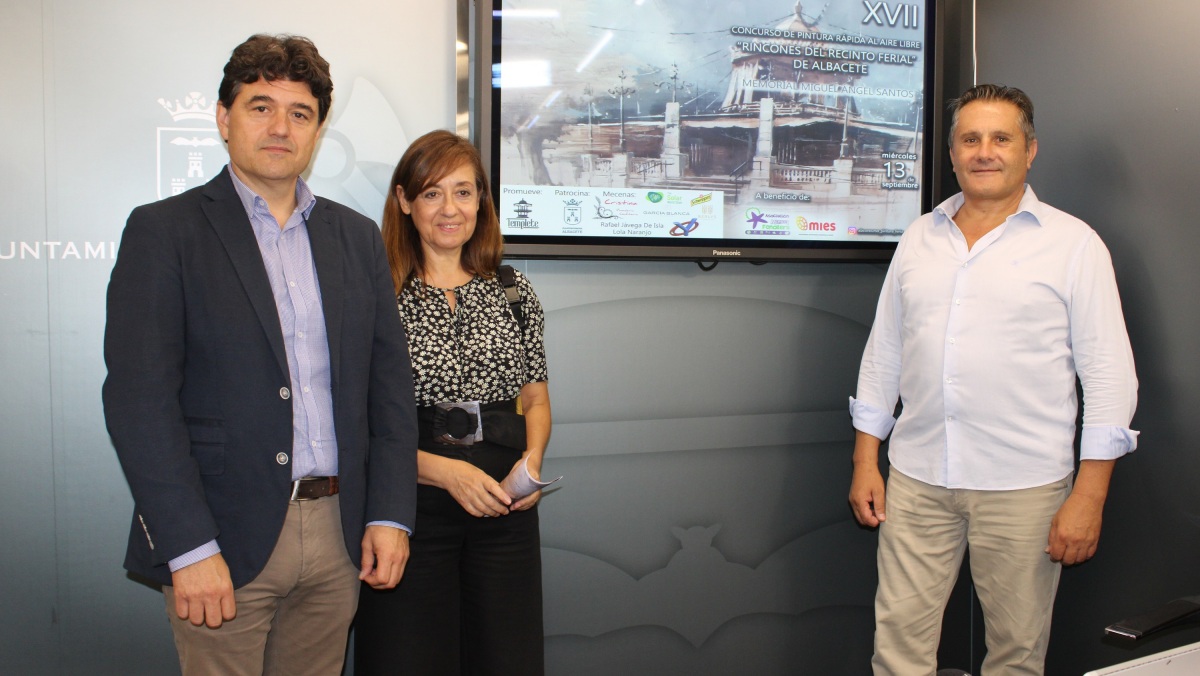 El concejal de Feria, Francisco Navarro, ha presentado el XVII Concurso de Pintura Rápida al Aire Libre ‘Rincones del Recinto Ferial de Albacete’ junto a Rafael Jávega, promotor de la actividad, y Llanos Gómez, la mujer del tristemente fallecido Miguel Ángel Santos, cuyo nombre llevará este concurso a partir de este año en señal de agradecimiento y reconocimiento por su labor incansable a favor de la Feria durante su etapa como jefe del servicio municipal de Cultura y Festejos.