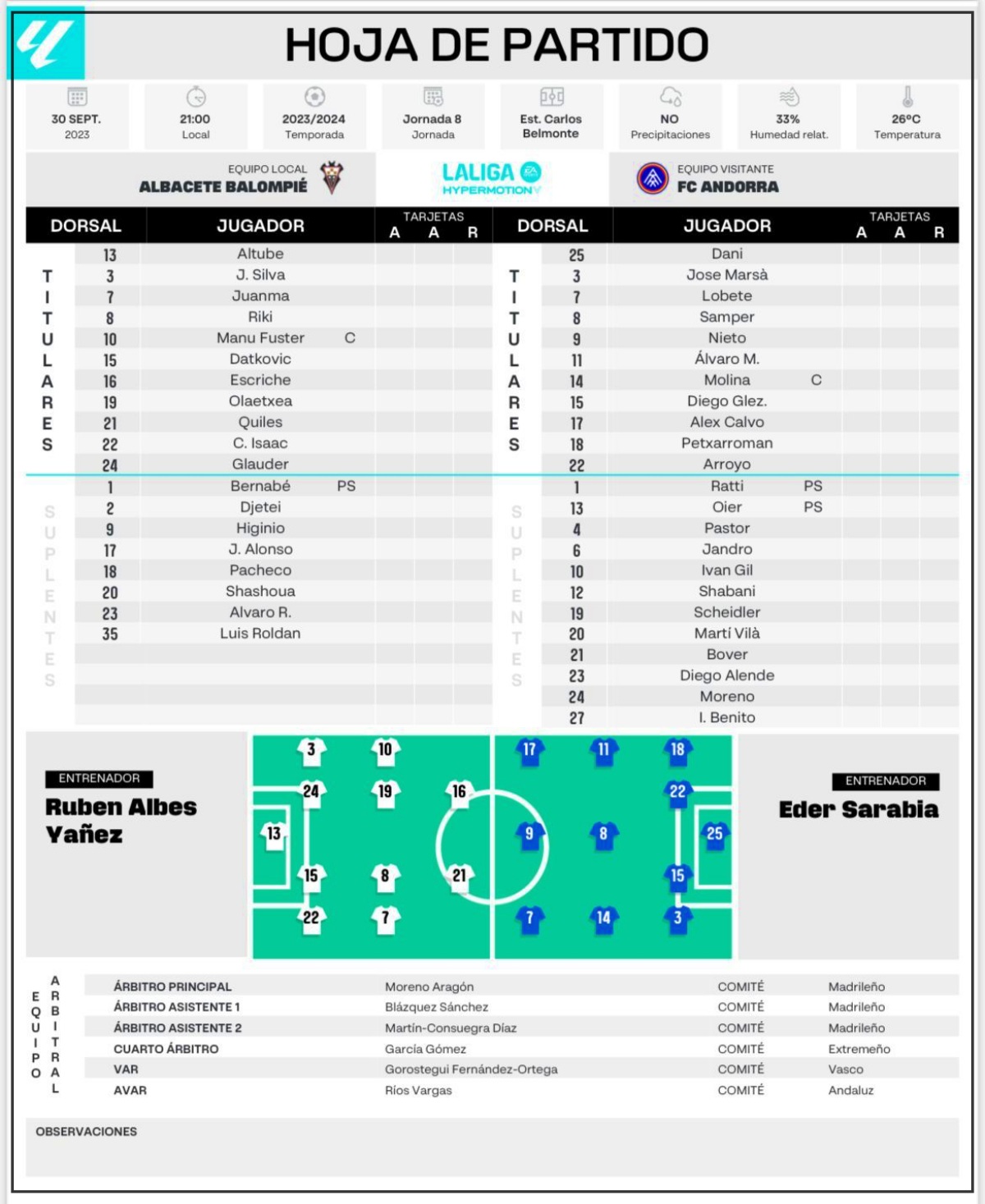 Moreno Aragón fue el colegiado de la contienda, un árbitro de infausto recuerdo para el Albacete Balompié durante la pasada temporada, ya que expulsó a Riki en el duelo ante la Ponferradina disputado en el Carlos Belmonte y atracó a mano armada a los blancos en el Nuevo Los Cármenes de Granada, donde levantó todas las sospechas ya que aunque está adscrito al colegio madrileño de árbitros es granadino de nacimiento, granadinista de corazón y nieto de uno de los ex presidentes de la entidad nazarí. Ahí es nada.