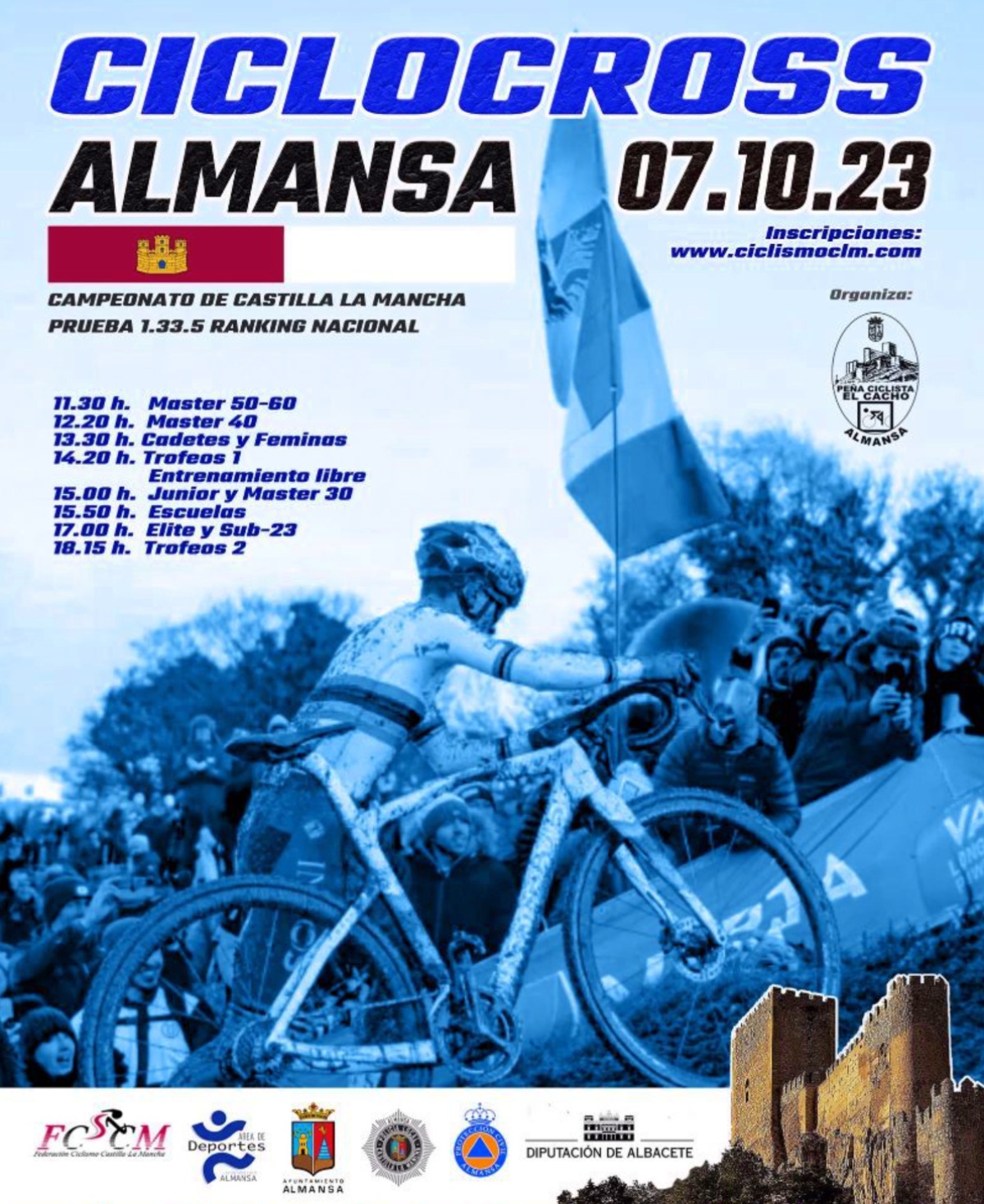 Más de doscientos ciclocrosistas llegados de toda España se darán cita este sábado 7 de octubre en Almansa (Albacete) para participar en la primera de su Ciclocrós Castillo de Almansa, Campeonato de Castilla-La Mancha 2023 de la modalidad y puntuable para el ranking nacional. Todo un éxito de convocatoria en su estreno en el calendario regional, tras el que está el trabajo organizativo de la Peña Ciclista El Cacho.