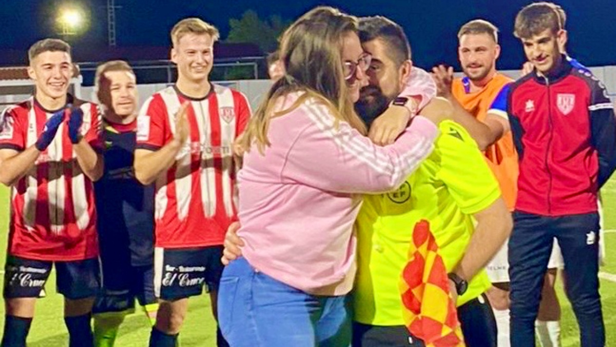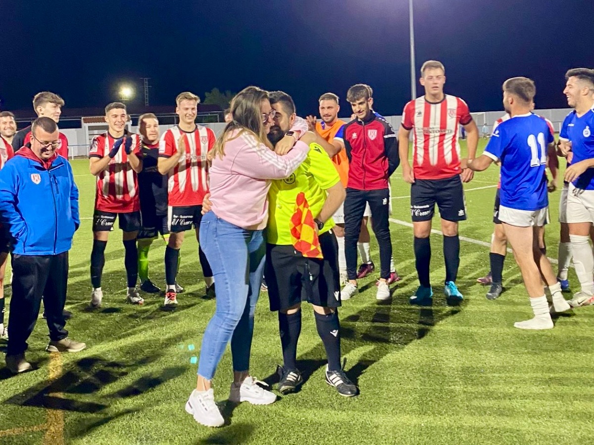 Rodeado de los jugadores a los que acababa de arbitrar, compañeros árbitros, familia y amigos, Andrés proponía matrimonio al amor de su vida y ahora prometida. Tras este meditado gesto, bien preparado a lo largo del mes previo en secreto y con el presidente del Comité Técnico de Árbitros de la Federación de Fútbol de Castilla-La Mancha, Cristian García, como colaborador imprescindible, tanto jugadores de ambos equipos como los recién prometidos se fundían en un gran abrazo de alegría y alborozo al que se unían el resto de asistentes a la pedida.