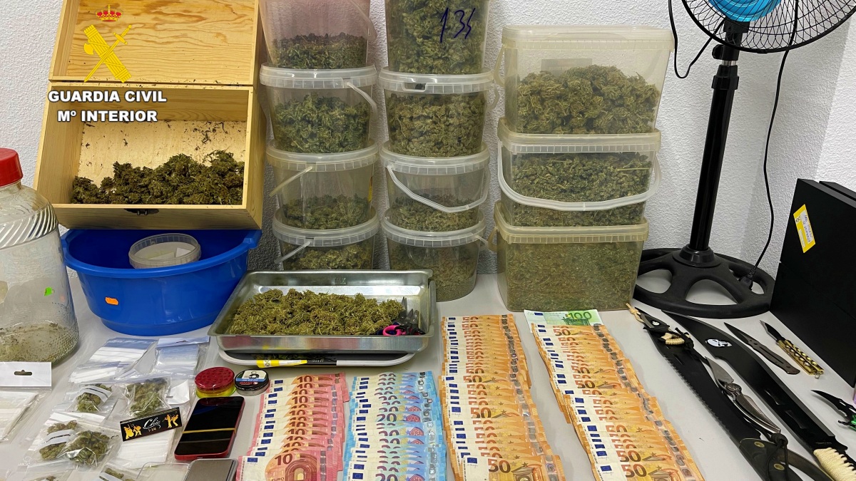 Tras identificar a las personas que estarían detrás de esta actividad delictiva y con el oportuno mandamiento judicial, la Guardia Civil llevó a cabo un registro en la vivienda investigada donde se intervinieron 4.715 gramos de cogollos de marihuana, 3.500 euros en billetes de diferente valor y una báscula de precisión, utilizada para el pesaje de la droga.