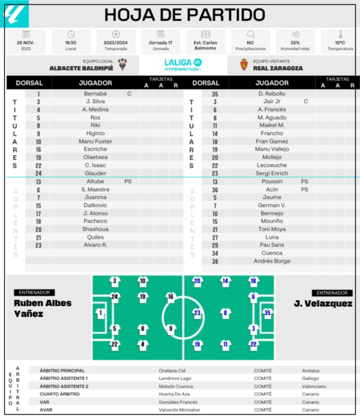 Albacete Balompié: Álvaro Rodríguez por Carlos Isaac (min 32), Julio Alonso por Jonathan Silva (min 46), Alberto Quiles por Higinio Marín (min 69), Shashoua por Fuster (min 87) y Juanma por Medina (min 87)