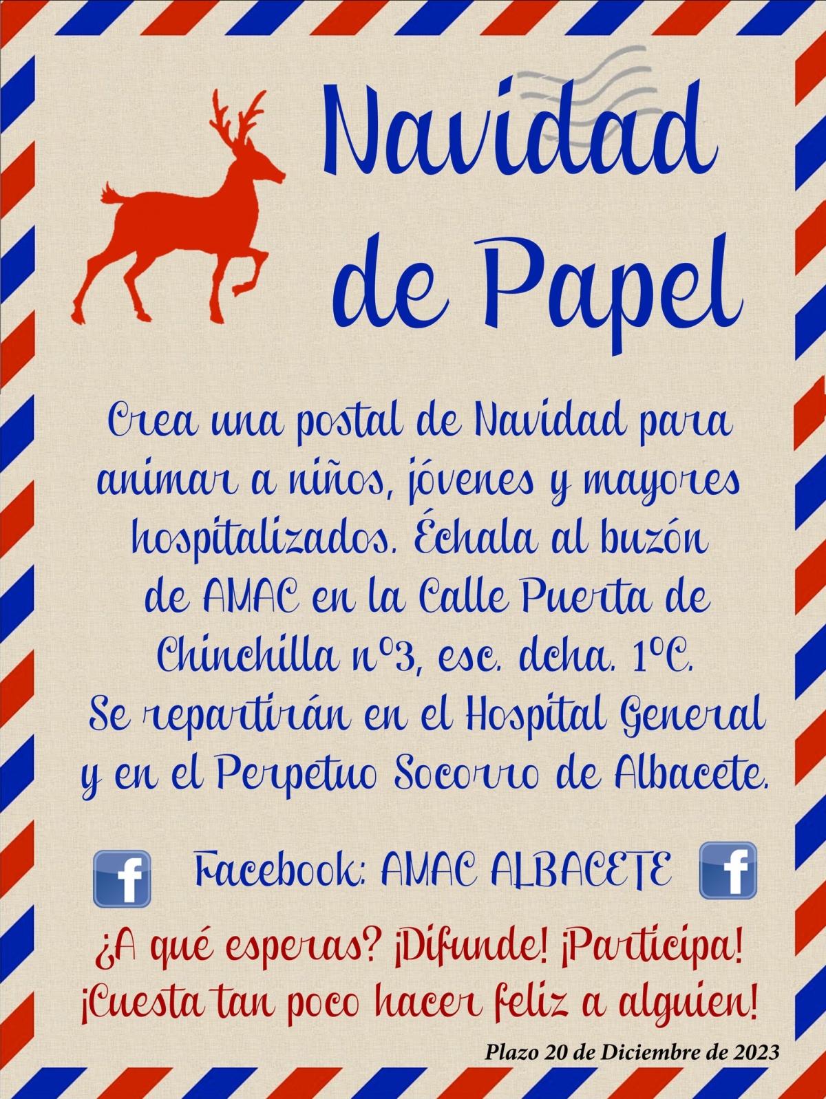 El objetivo de ‘Navidad de Papel’ es que personas de todas las edades den rienda suelta a su imaginación para crear postales navideñas con mensajes de cariño y esperanza para los pacientes hospitalizados en Albacete. Así, los albaceteños podrán depositar estas postales en un buzón instalado en la sede de AMAC, haciendo llegar de este modo sus mejores deseos para estos pacientes.