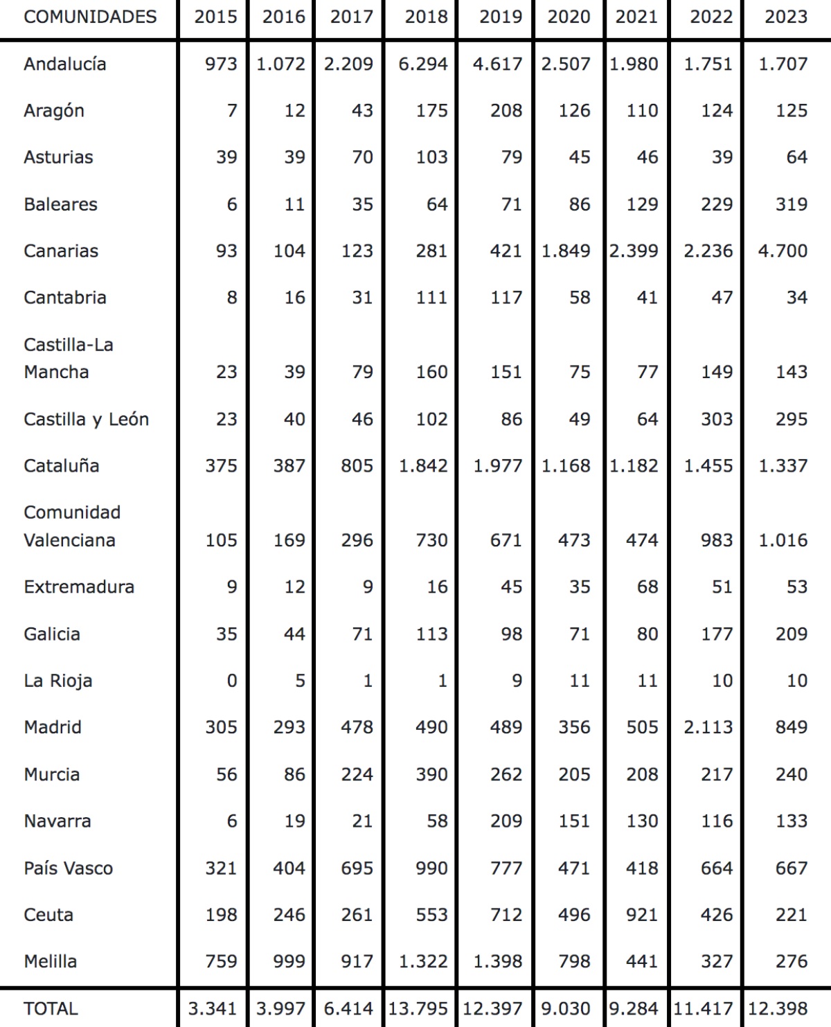 La siguiente tabla recoge, por años, el número de menores extranjeros no acompañados acogidos en las diferentes comunidades autónomas desde 2015.